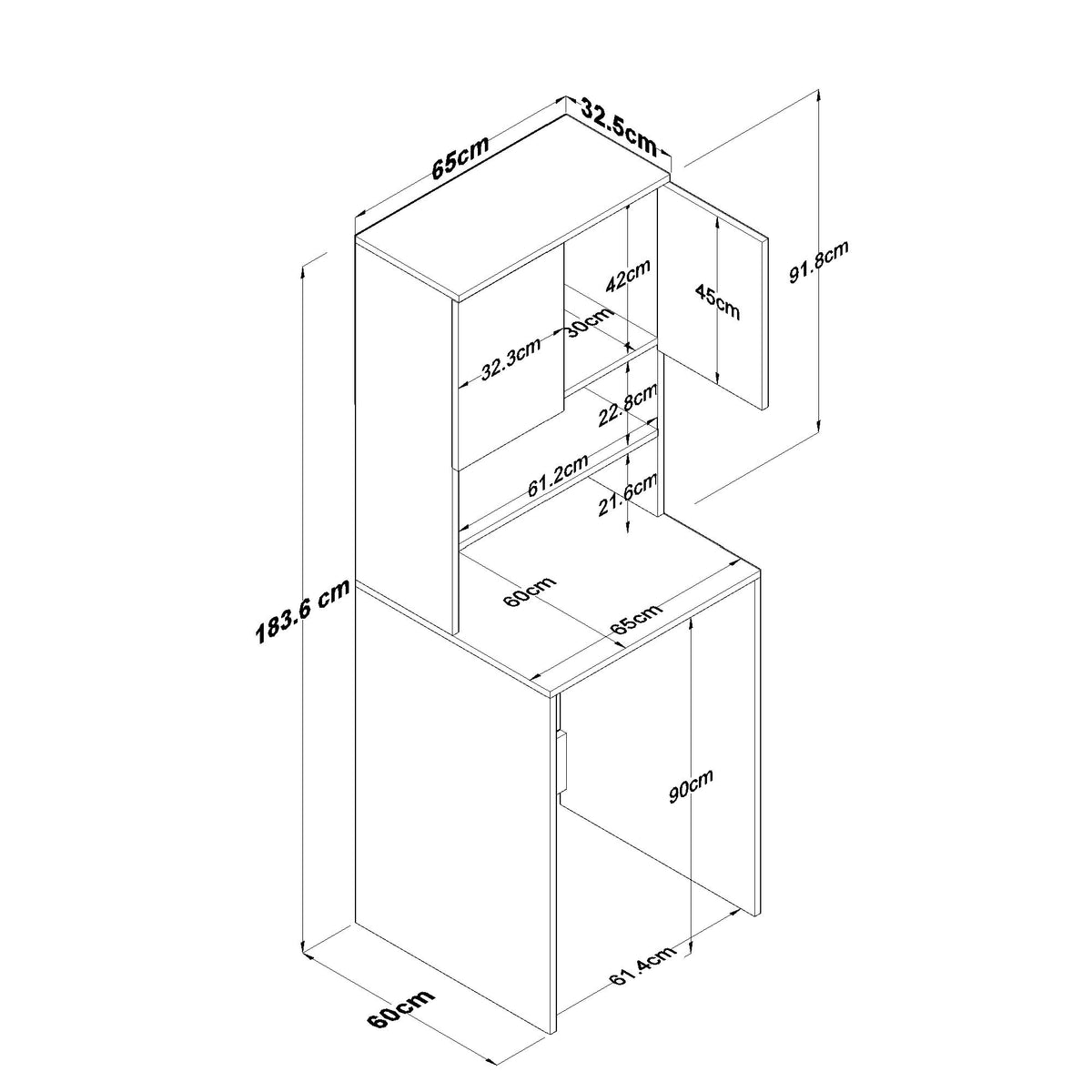 Genişlik: 65 cm – Derinlik: 60 cm – Yükseklik: 184 cm