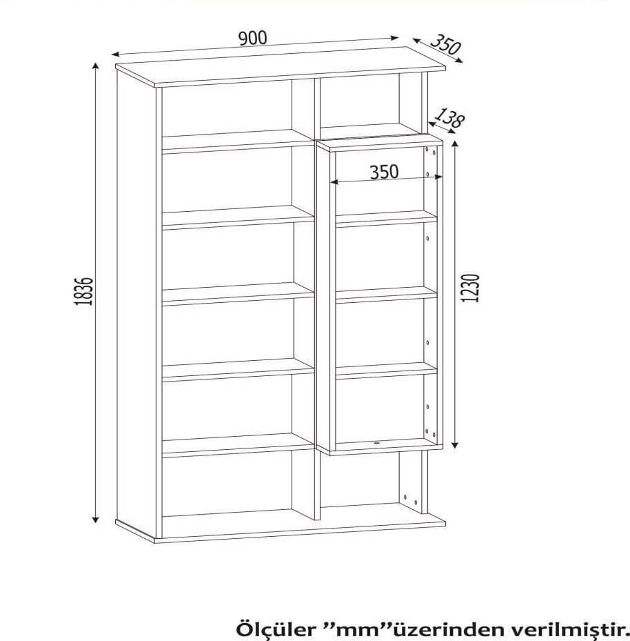 Genişlik: 90 cm – Derinlik: 35 cm – Yükseklik: 184 cm