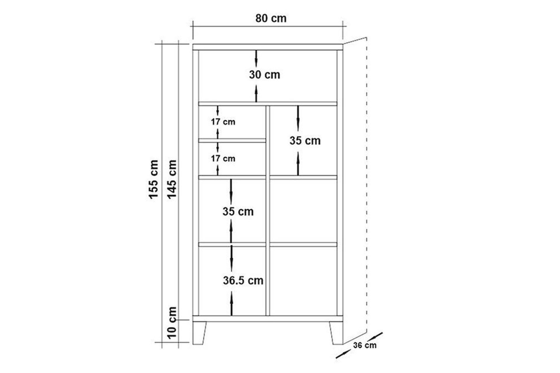 Genişlik: 80 cm – Derinlik: 36 cm – Yükseklik: 155 cm