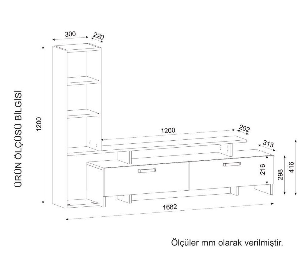Genişlik: 170 cm – Derinlik: 35 cm – Yükseklik: 120 cm