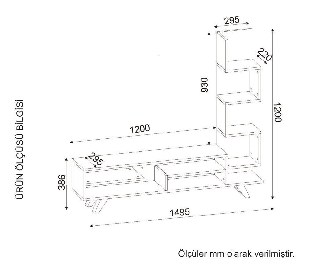 Genişlik: 120 cm – Derinlik: 35 cm – Yükseklik: 150 cm