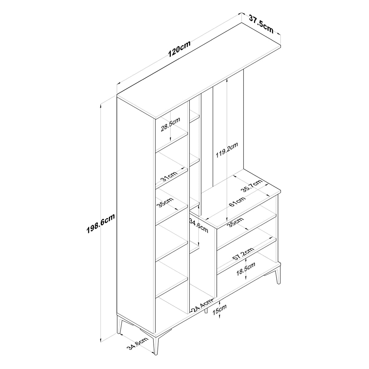 Genişlik: 120 cm – Derinlik: 35 cm – Yükseklik: 199